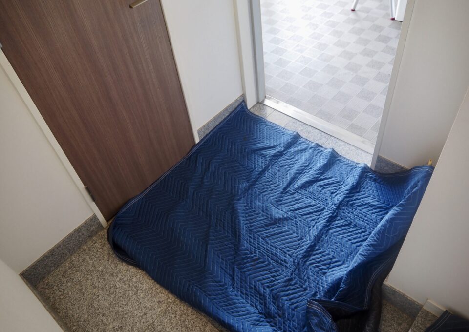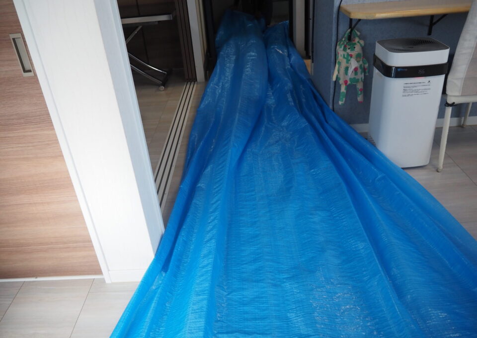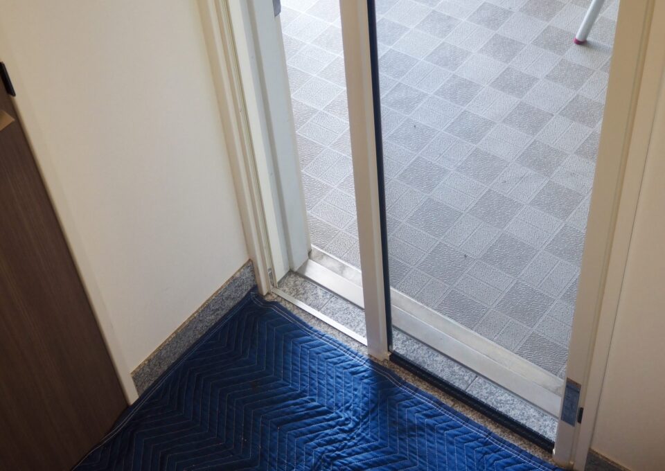 周囲に十分に注意しながら障子を搬入しています。もう一枚の障子が荷台で倒れないように、短い時間でもロープで固定しています