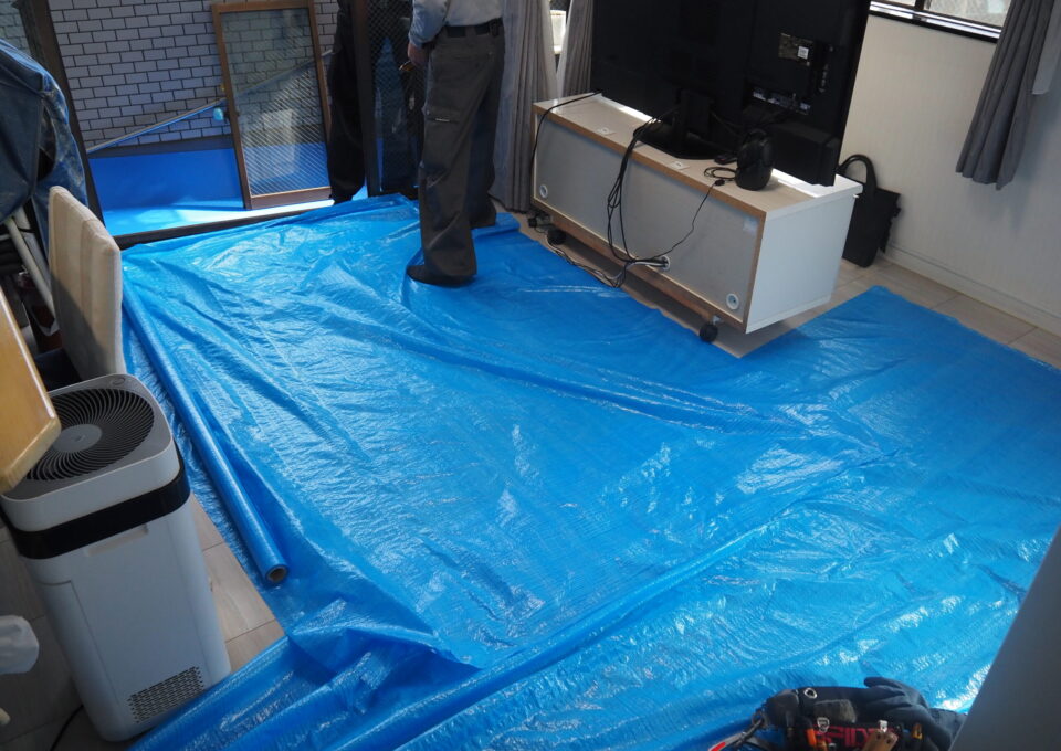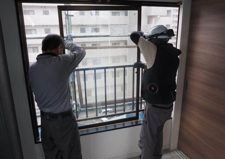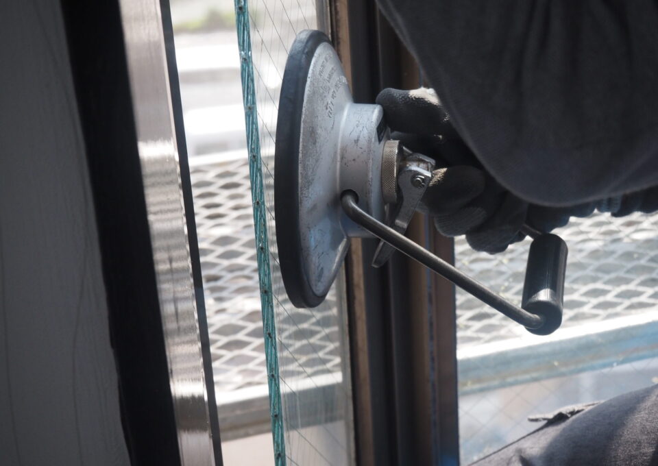 割れたガラスを取り外し、寸法を採寸。ペアガラスなので、製作に1週間~2週間程度要します。